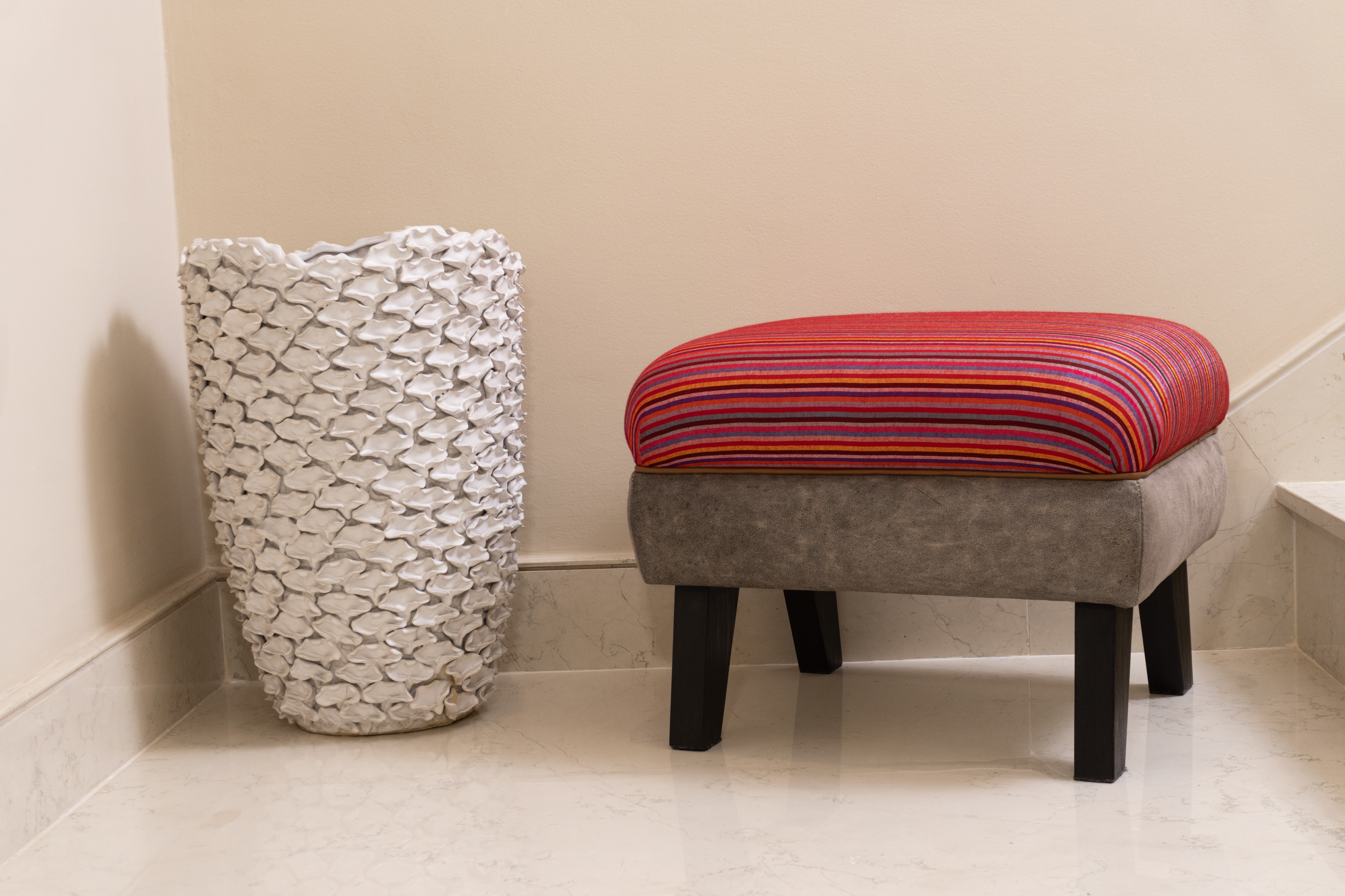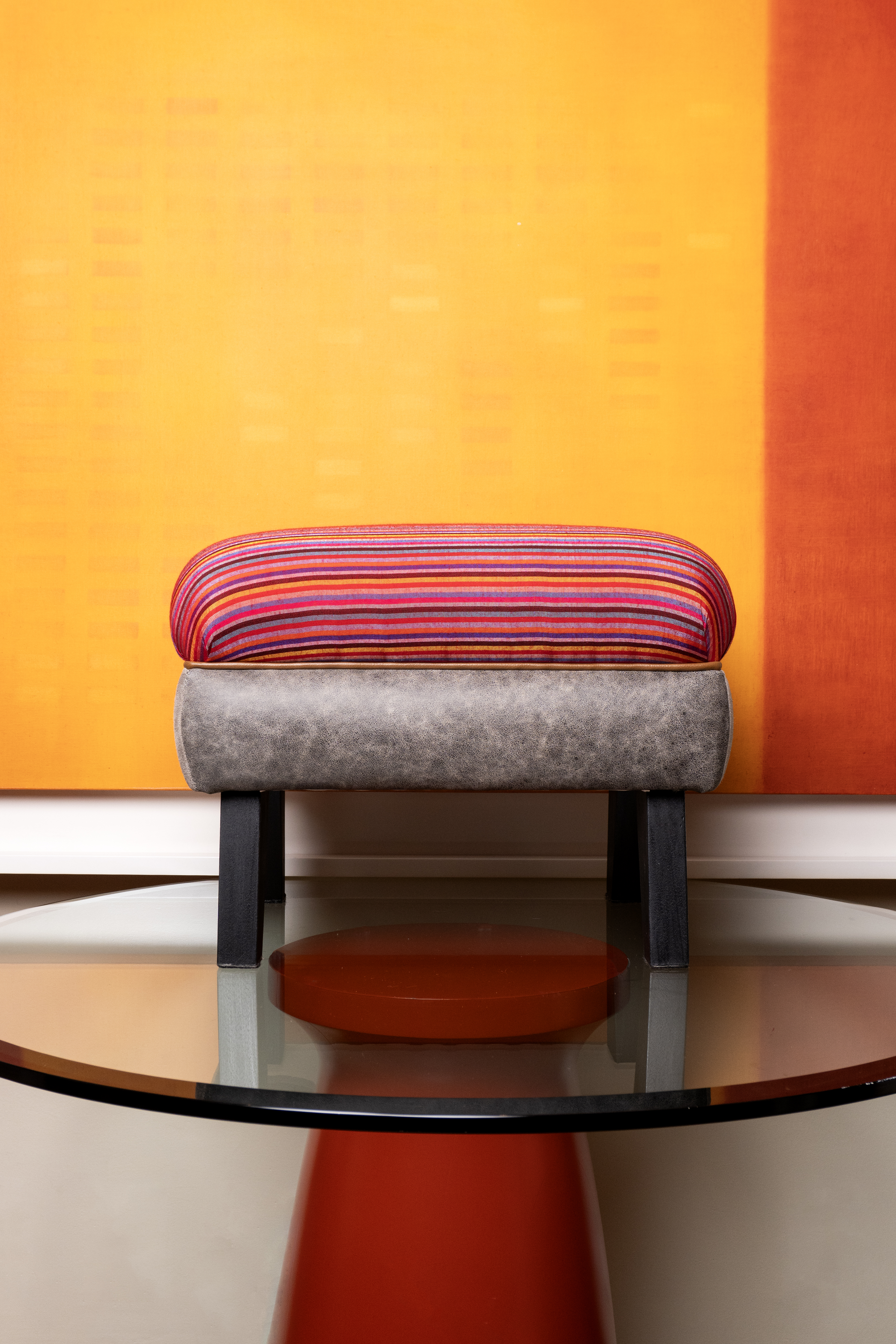 Produzido com tecido de algodão, couro bovino, madeira.