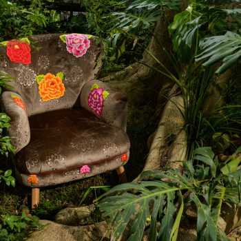 Chelita corre colhendo as flores que enfeitarão seu cabelo.