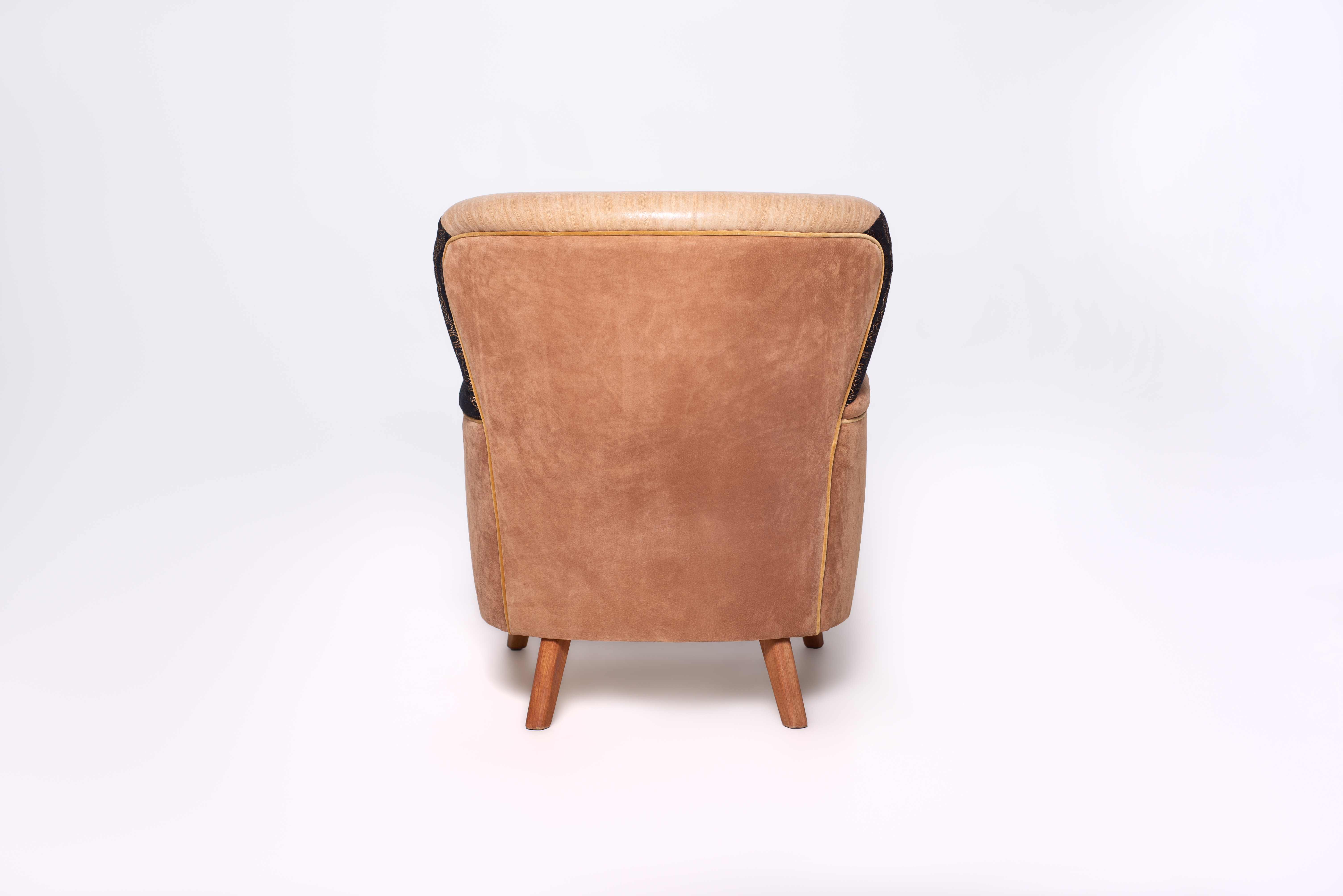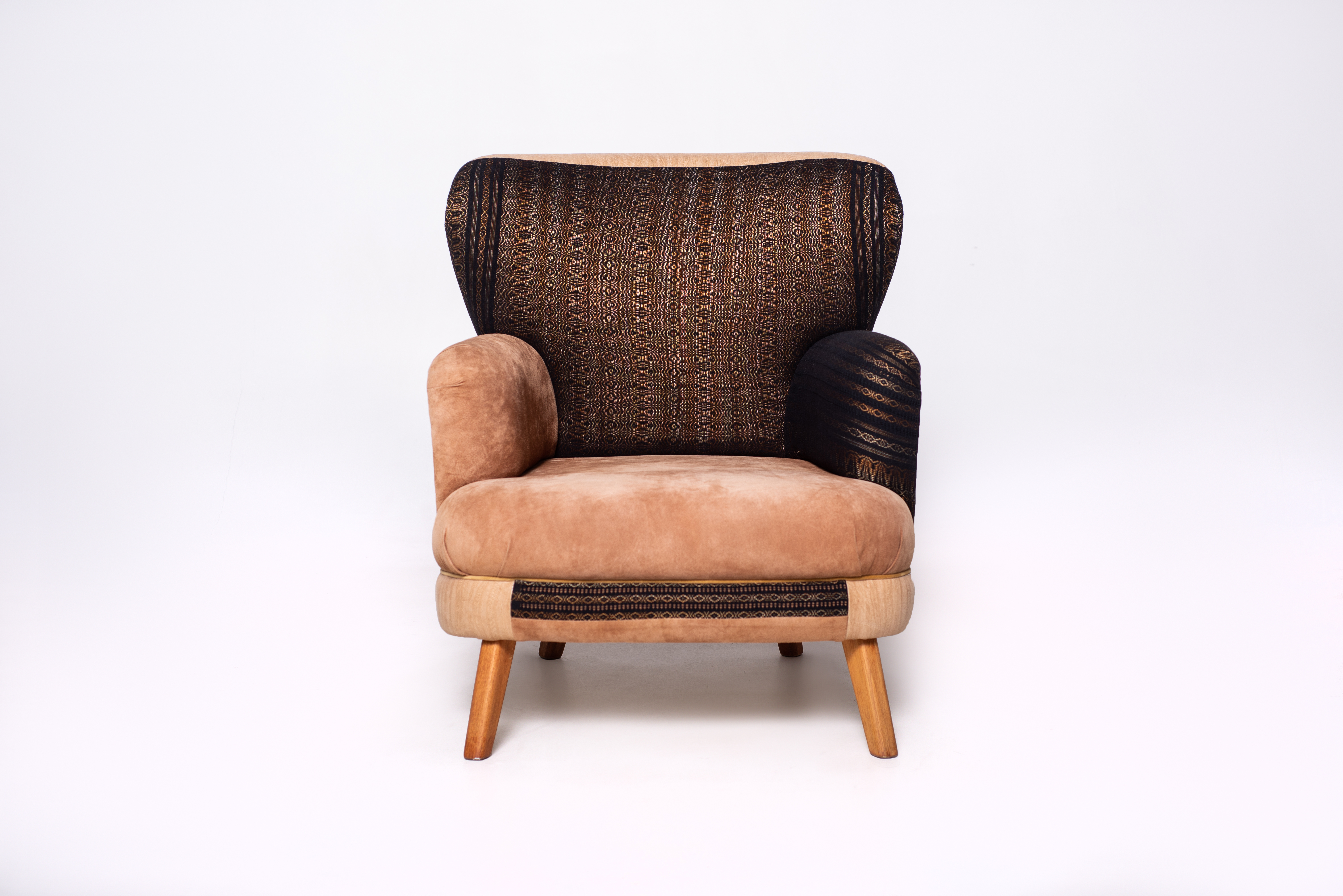 A mistura de diferentes couros é realçada nessa poltrona pela transparência do xale, que permite ver a pele bor baixo de si, como a nudez recatada de uma mulher.