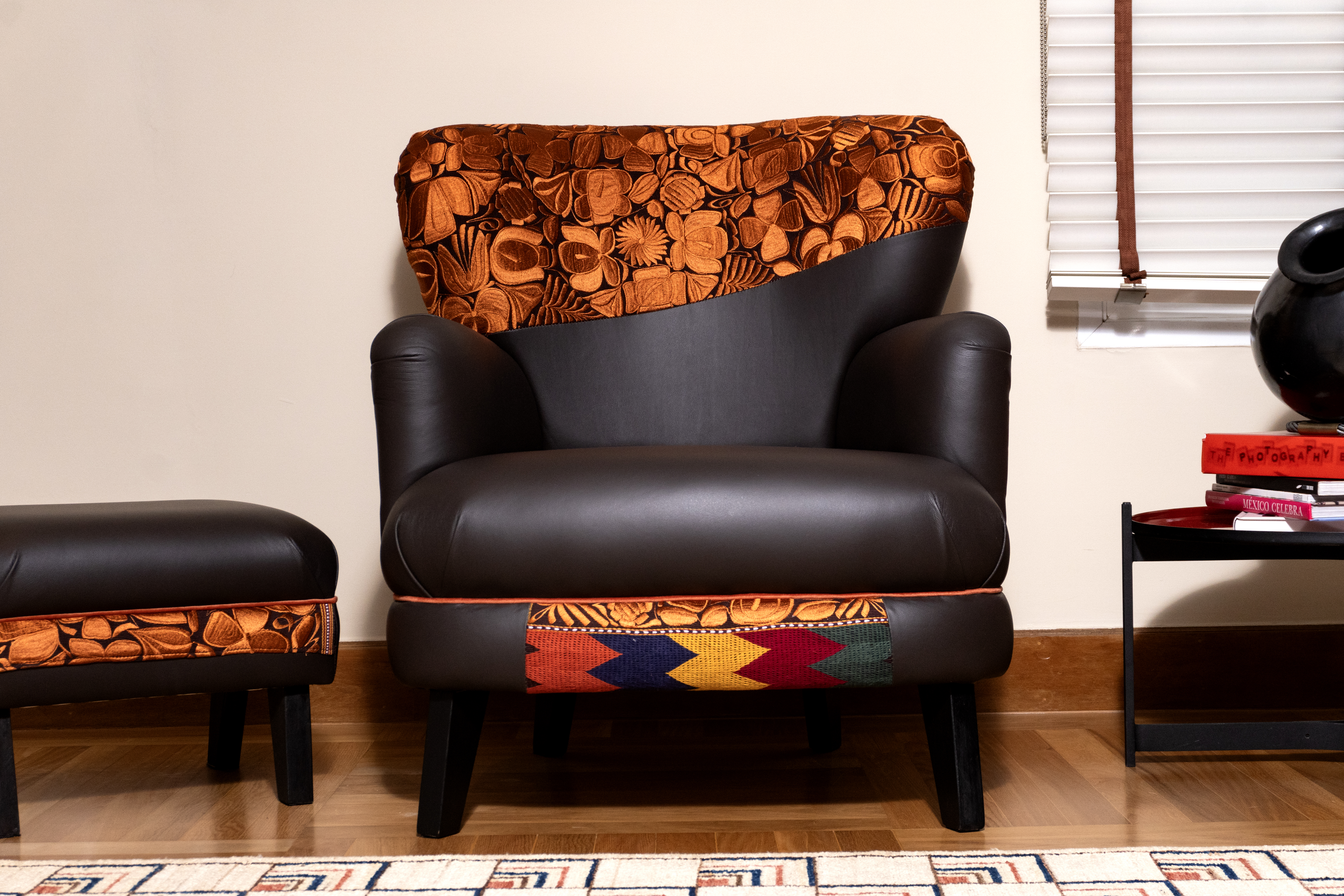 Produzida com tecido de algodão e couro bovino.