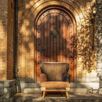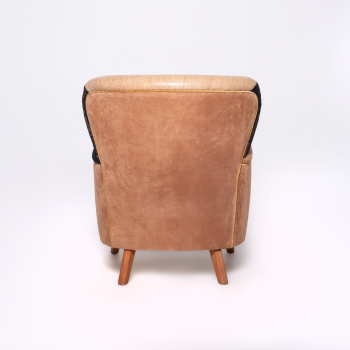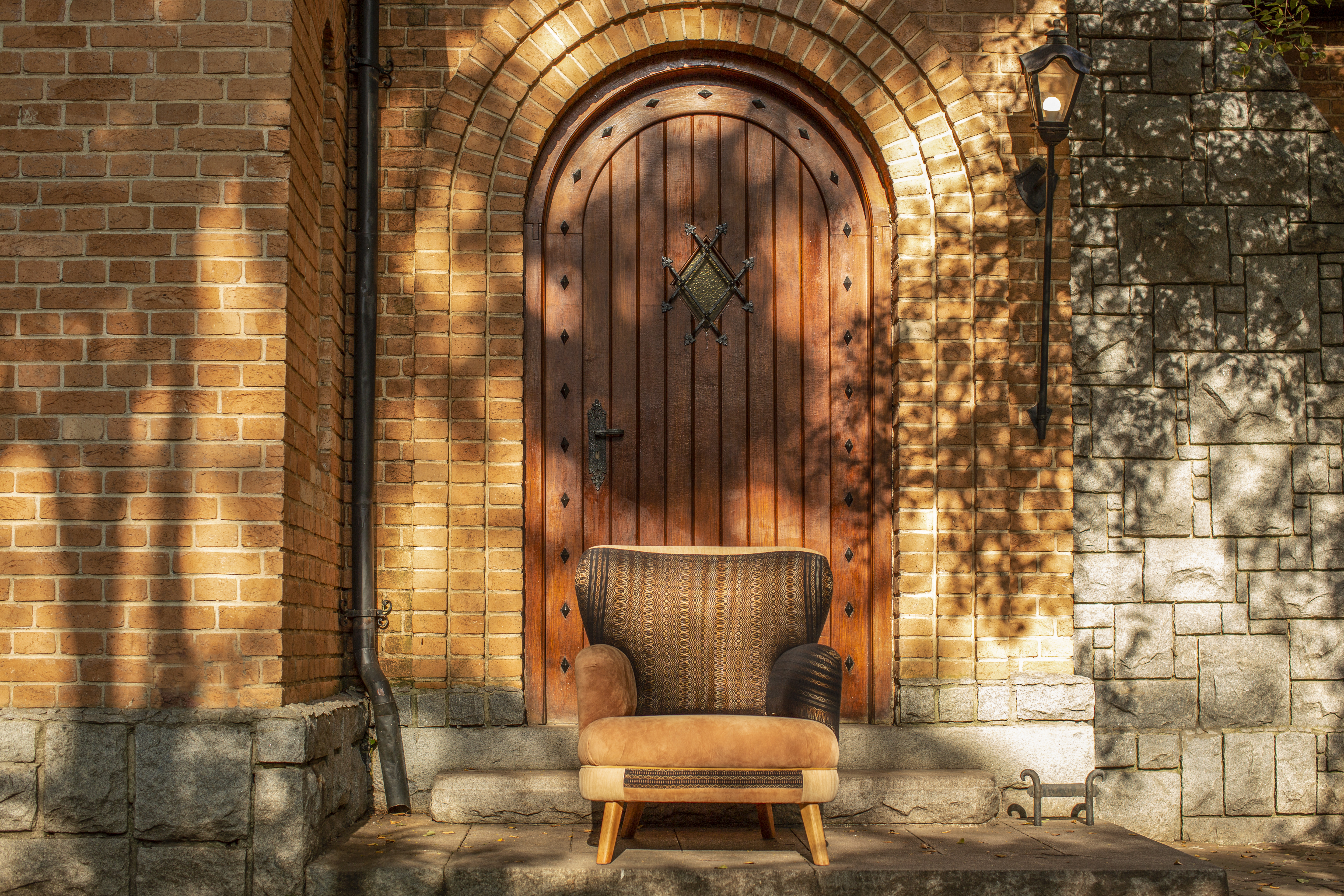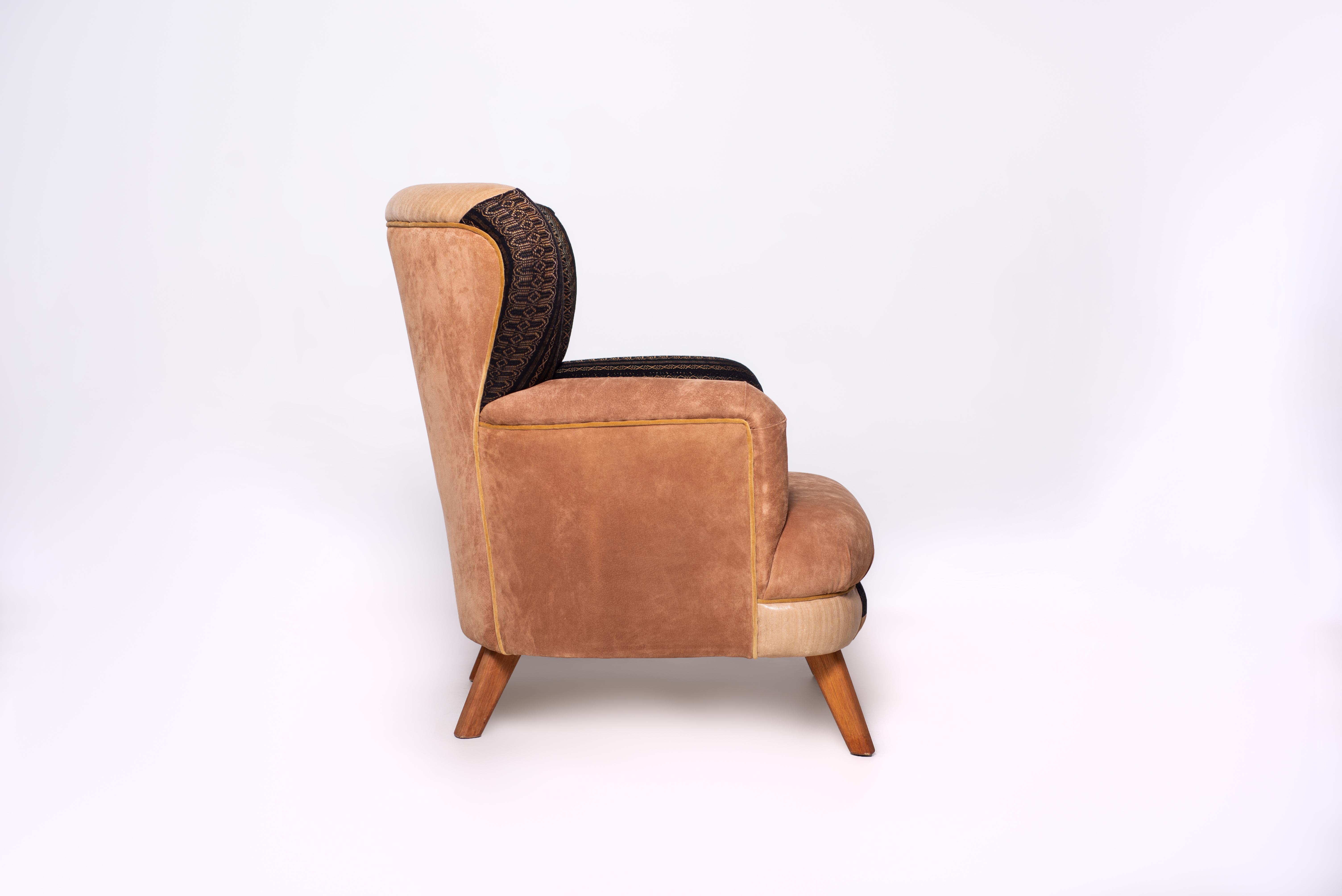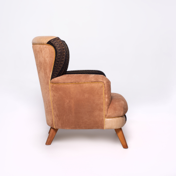 A mistura de diferentes couros é realçada nessa poltrona pela transparência do xale, que permite ver a pele por baixo de si, como a nudez recatada de uma mulher.